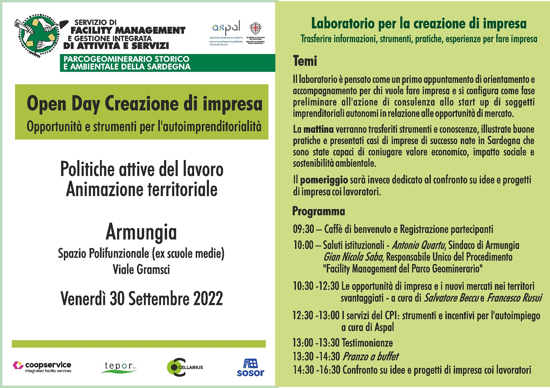 Il 30 Settembre ad Armungia si è tenuto un open day per la creazione di impresa, per illustrare ai lavoratori le opportunità e gli strumenti per l’autoimprenditorialità.