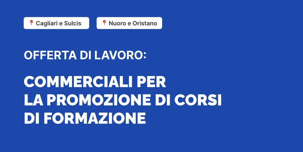Ricerca Commerciali per la promozione di Corsi di Formazione in Sardegna Unisciti al team Sosor e costruisci la tua carriera nella formazione! Siamo un’azienda di Servizi per la Formazione, con una posizione leader nella crescita professionale di aziende e persone in Sardegna. Cerchiamo 2 Commerciali automunite/i per potenziare nostra rete in Sardegna, nelle aree: Zona […]