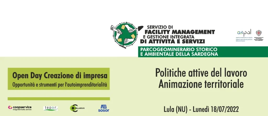 NUOVE PROSPETTIVE PER IL LAVORO Il progetto: chi siamo e cosa facciamo Proseguono gli incontri per le “Politiche attive del lavoro – Animazioneterritoriale” a favore dei lavoratori del Parco Geominerario StoricoAmbientale della Sardegna. Il giorno 18 Luglio a Lula si terrà un OPEN DAYper la Creazione di Impresa, che illustrerà ai lavoratori le Opportunità egli […]